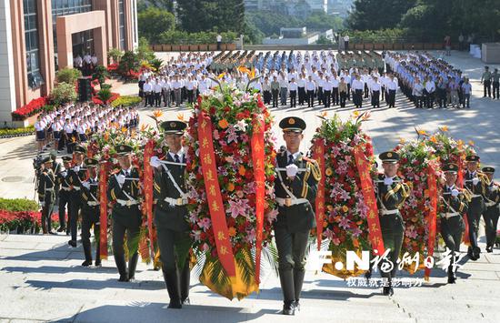 福州市文林山革命陵园内,苍松翠柏、庄严肃穆,革命烈士纪念碑巍然矗立在陵园的中央,纪念碑上“革命烈士永垂不朽”8个大字熠熠生辉。广场前,省委,省人大常委会,省政府,省政协,驻闽部队官兵,省各民主党派、工商联和无党派人士,省各人民团体和各界群众,老战士和烈士亲属,全省少先队员分别敬献的9个花篮一字排开。