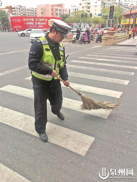 泉州网4月9日讯 (记者陈祥木 文/图)一辆行驶在市区刺桐路上的汽车突然掉落下一块玻璃,导致碎玻璃溅满斑马线。在附近值勤的协警陈鑫亮发现后,马上借来扫帚清扫碎玻璃,过路市民纷纷称赞其是“最美协警”。