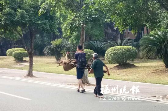 照片拍摄者是闽江学院人文与传播学院汉语言文学专业大一女生李同学。她告诉记者,那是6日清晨7时35分左右,她晨跑结束后在闽江学院思远路附近路段,看到一名个子瘦小、白发苍苍的老人挑着两箩筐木头前行,箩筐里的木头很多,老人挑担走路的样子很吃力。就在这时,一名背着书包的小伙子跑上前去,想帮助老人。