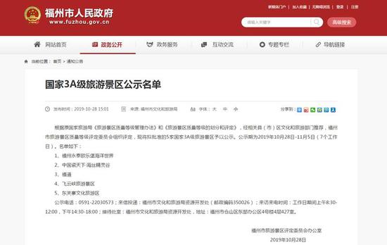 10月28日,福州市政府网站公布《国家3A级旅游景区公示名单》,福州5个景区上榜,分别是: