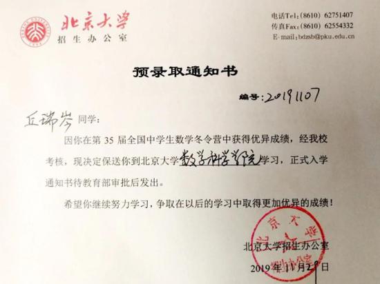 据了解,金惟楚在第35届全国中学生数学联赛中获得银牌。在去年底,金惟楚通过清华大学丘成桐数学英才班的综合测试、学科能力测试(包括数学一试和数学二试)、心理测试、面试,最终挤进前30名,并获得《清华大学2020年“丘成桐数学英才班”入围认定证明》。这次提前一年参加高考,获得清华大学录取的优惠政策。