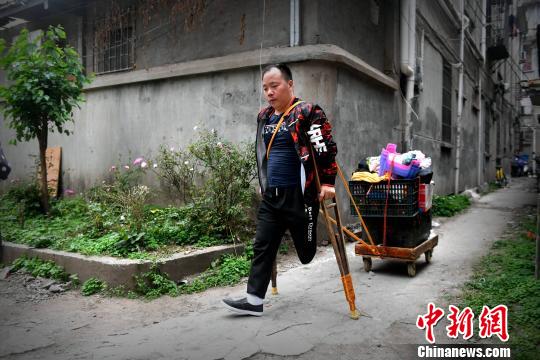 中新网福州电 (叶秋云)4日,在福建省福州市仓山区街头,“独腿哥”王胜利身上一根黄色的布条连接着后面简陋的“四轮小车”,拉着摆摊用的“物料”,拄着双拐向前行。