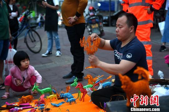 蚂蚁、蚱蜢、蜘蛛、蛇、马……他的摊子,像一个动物王国,吸引了众多行人驻足。