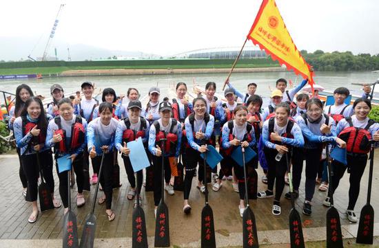 图:福州大学龙舟队正在比赛(红、蓝队服)。
