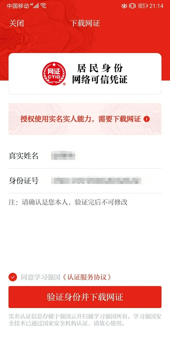 用户填写真实姓名、身份证号码,勾选“同意学习强国《认证服务协议》”,根据提示完成人脸识别后,即可完成实名认证。