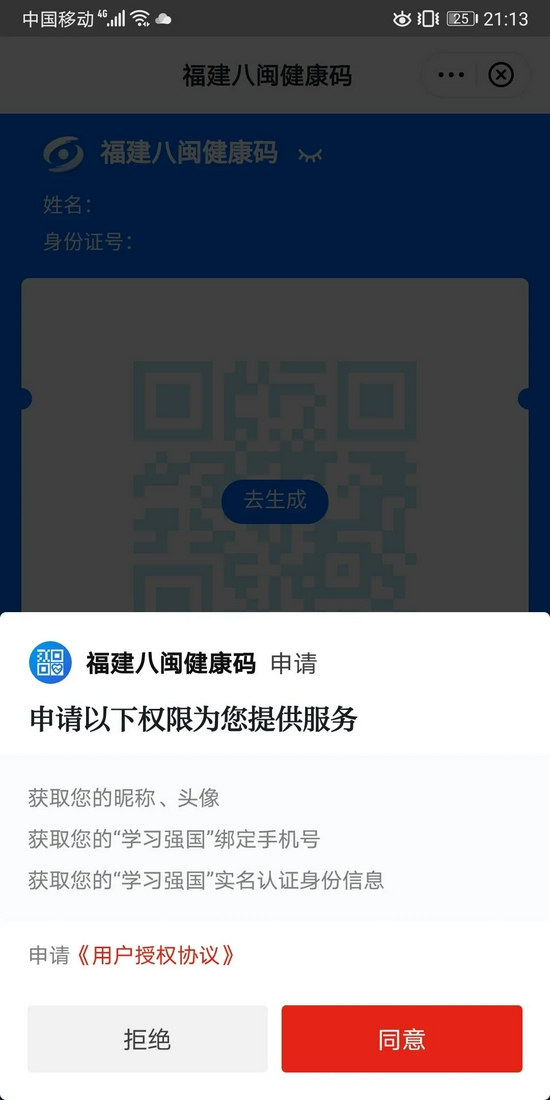 用户下载登录学习强国APP,打开首页右上角“我的”,选择“强国应用”或在福建本地频道,点击“福建八闽健康码”小程序,点击“同意”获取位置信息与进行个人信息授权后,再点击“确定”进行实名认证。