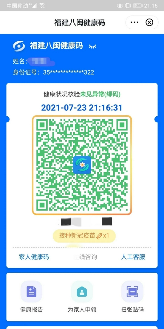 用户点击左上角“关闭”,返回“福建八闽健康码”申领页面,选择“去生成”完成个人“福建八闽健康码”申领后,也可在线“为家人申领”及“查询核酸检测报告”。