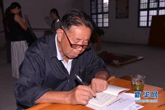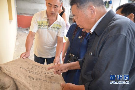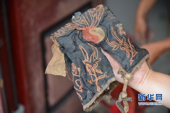 3 / 88月24日,禾洋村四平剧团团员李典亮在一件华盖(剧中道具)上发现了一行文字,记录了这件华盖是嘉庆12年(1807年)由村中‘福首’李某所添置。新华网 程立葳 摄
