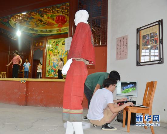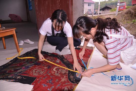 6 / 88月24日,闽江学院服装与艺术工程学院的学生在测量戏服的尺寸。禾洋村四平戏剧团现存有30多件古戏服,其中18件保存较为完好。新华网 程立葳 摄