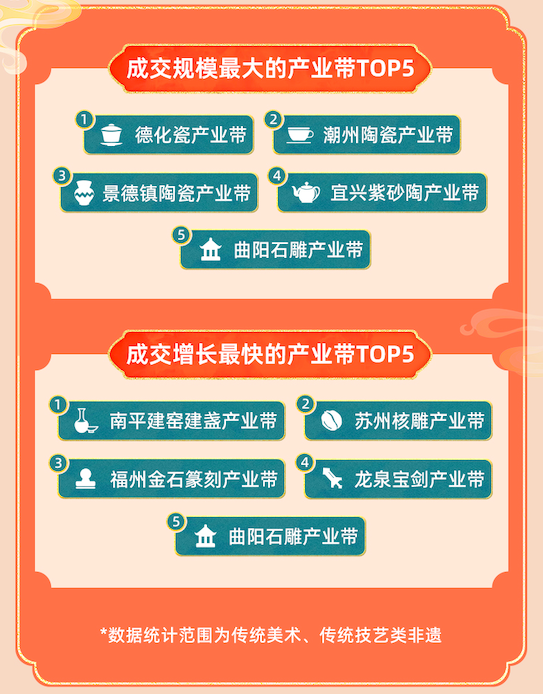 数据显示,截至今年6月底,有14个非遗产业带在淘宝上年成交过亿。其中,作为日用程度最高的商品,陶瓷相关的非遗产业带规模也是最大的。德化瓷产业带、潮州陶瓷产业带、景德镇陶瓷产业带、宜兴紫砂陶产业带分别占据了成交规模前五位中的4席。而南平建窑建盏产业带则称为平台成交增长最快的产业带,领先于苏州核雕产业带和福州金石篆刻产业带。