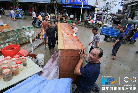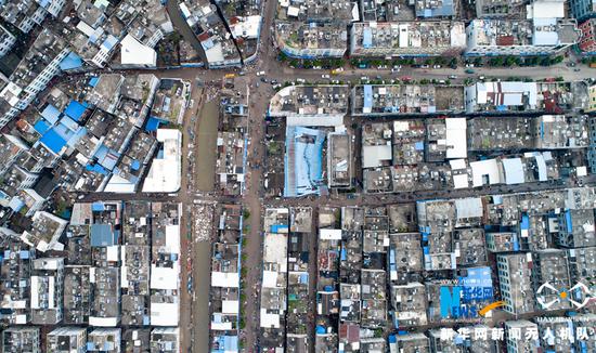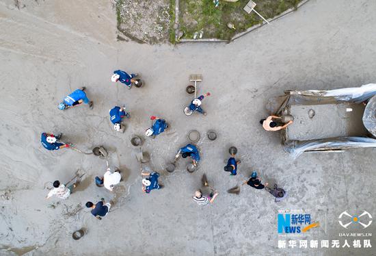 12日中午,在牙城镇镇区的一所中学内,学校老师和蓝天救援队队员正在加紧清理淤泥。学校虽然放暑假了,但灾后自救工作并未迟缓(无人机拍摄)。