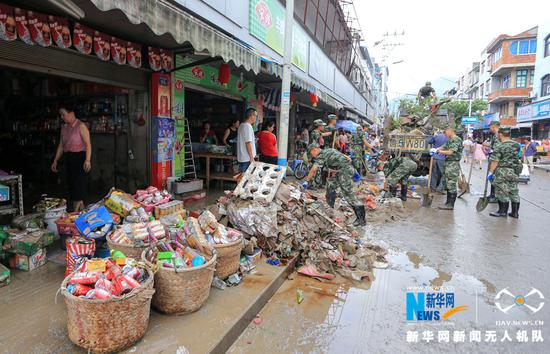 12日,武警官兵上街帮助居民清理家园。沿街店铺里,一些受损的商品被清理出来。商铺经营者说,虽然受灾很重,但生意还要继续做下去。新华网肖和勇 摄