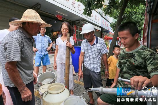 台风造成牙城镇供水困难。12日,当地消防部门开消防车到镇上送水。居民很欢喜,纷纷排队取水。新华网肖和勇 摄