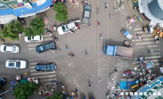 12日上午,在牙城镇镇区,一些被清理干净的路段上小车正常往来,居民在十字路口摆摊买卖,生活慢慢恢复常态。新华网 肖和勇 摄