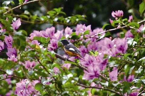 如今,成群的北红尾鸲在植物园安营扎寨。乍一看,北红尾鸲好像穿上橙红色的“肚兜”。不喜欢高空飞翔的它,似乎很胆小,一有动静就立马藏匿到丛林,所以观测较困难。因此,北红尾鸲被观鸟人士戏称为害羞的“老朋友”。