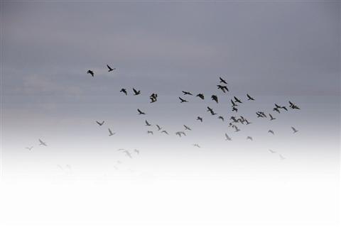 天空飞过一大群黑压压的鸟,如同大军压境,声势浩大。它们时而低空盘旋,时而展翅高飞,时而俯冲嬉戏,时而队列呈“人”形排开,时而呈“一”字形。