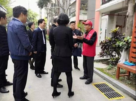 来到金安社区,何国辉副部长边走边看,不时询问“四就近”工作开展情况。