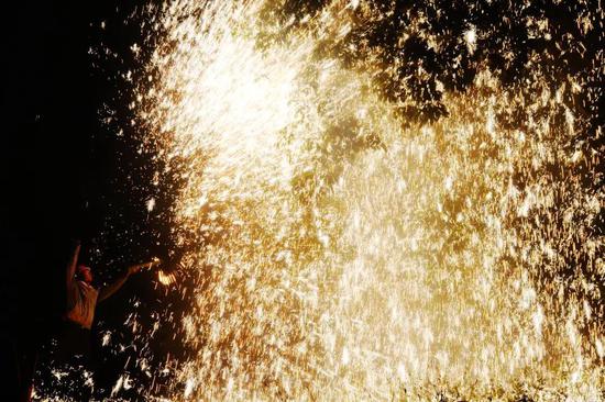 打砂花要提前一两天准备,家家户户收集生铁、废铁,元宵当天敲碎后,投入2米多高的火炉中,找准时机用鼓风机“吹风”,铁融化成1300多摄氏度的铁水后,用竹片舀起,泼向荔枝树间,碰撞出烟花般的绚烂花火。