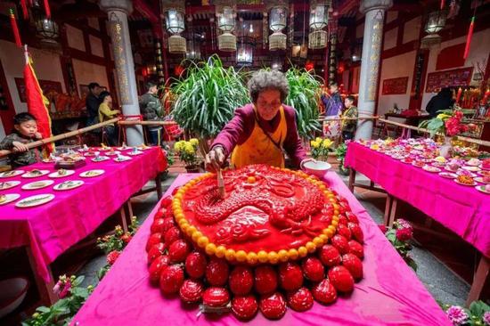 “莆田家家户户都会做红团,小小的红团寓意红红火火、团团圆圆。”黄天裕说,霞徐社区的“超大红团”需要多人合力制作,与普通红团使用红团印不同,“超大红团”表面的龙纹需要手工细细雕琢,制作完成后,龙目炯炯有神,鳞爪栩栩如生。最终的“超大红团”由56个小红团和一个大红团组成,象征着团结和团圆。