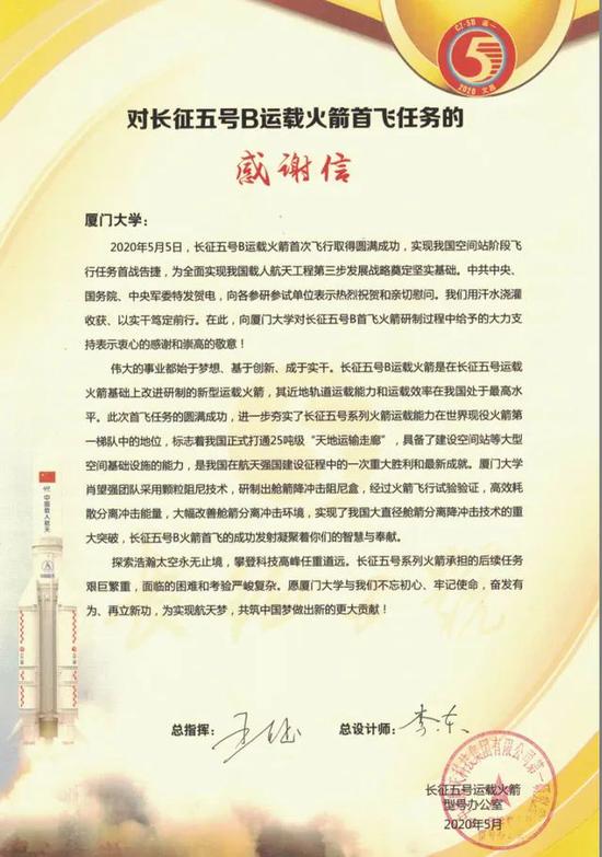 长征五号运载火箭型号办公室向厦门大学发感谢信