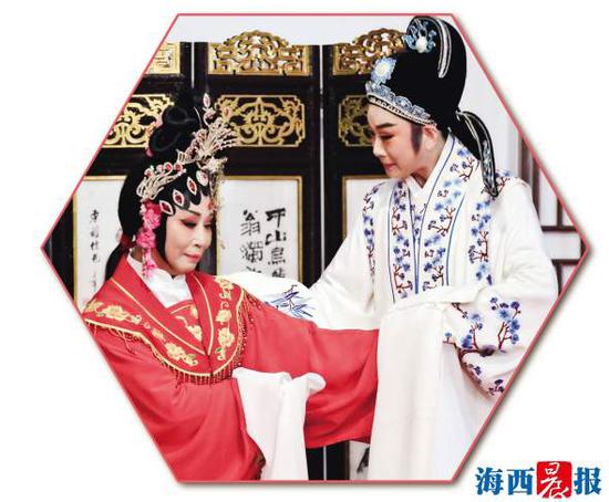 日前,厦门市金莲陞高甲剧团吴晶晶(右)和台湾新锦珠剧团陈锦姬合演《二度梅-重台别》。记者 陈翠仙 摄