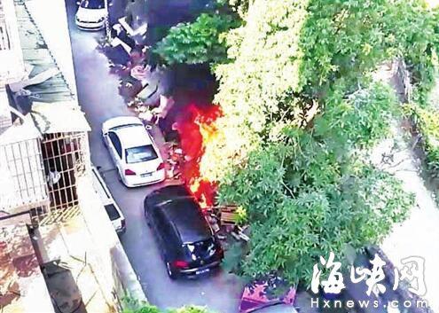 海都记者到达现场时,大火已被扑灭,小区围墙边堆放的废旧家具被烧得一片焦黑。两辆被引燃的车,一辆是别克轿车,白色车身被烤成褐色,另一辆是大众SUV,车头被烧黑。有知情者说,这辆SUV刚买几个月。