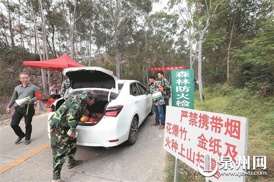 5日,在洛江区马甲镇仙公山路口,当地防火值班人员正在对上山车辆进行检查。(张九强 摄)