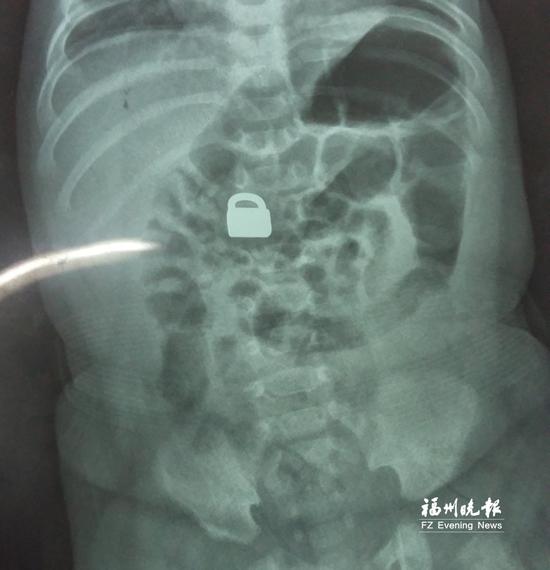 在当地医院观察了三天,“固执”的平安锁仍停留在宝宝腹内。无奈之下,家人们带着宝宝来到福州儿童医院求医。