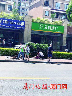 昨天上午9点40分左右,海沧沧林路上,阵风不断,一棵树被刮倒,一名过路的女士头部不幸被砸中。