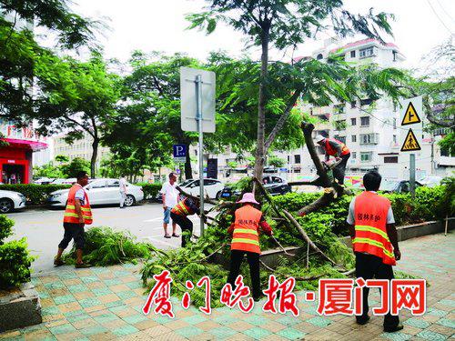 -园林工作人员正在处理倒伏树木。陈万泉摄 -昨天我市最大阵风11级,伞都撑不住。陈立新摄厦门网讯 (厦门晚报 记者 王东城 通讯员 蔡彦婷)今年第22号台风“山竹”出现了略微北调的趋势,今天它的路径依旧比预计的偏北一些。今天上午10点,它在距离广东台山东偏南方向约280公里处。预计,“山竹”将于今天下午到晚上在广东珠海到吴川一带沿海登陆(强台风级,14~15级,42~50米/秒),登陆后将继续向西偏北方向移动,强度逐渐减弱。市气象台上午变更发布台风预警四级。