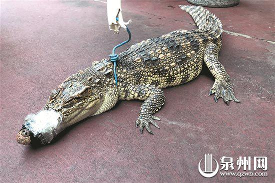 泉州网讯 (记者黄祖祥 张晓明 通讯员黄毅龙 文/图)3日下午4时许,在晋江青阳街道湖山苑室外停车场,正在玩耍的小孩突然发现有条鳄鱼出现,吓得赶紧叫来大人。众人看到这头鳄鱼个头比较小,便将它五花大绑地抓了起来。随后,消防人员接警赶到后,将鳄鱼用透明胶带进一步绑实并放置在袋子中,准备移交相关单位处理。
