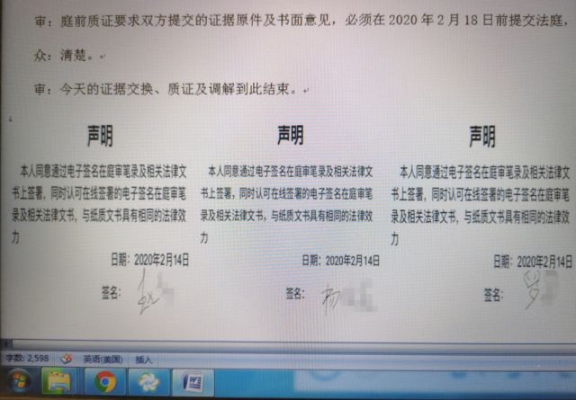 在线质证、调解开始前,承办法官向当事人简要释明在线质证、调解方式。鉴于目前疫情防控期间的特殊情况,如双方未能达成调解,法庭将采用线上开庭的方式进行审理。