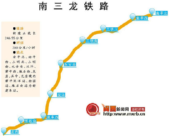 南三龙铁路位于南平、三明、龙岩三市境内,线路起自在建合福铁路南平北站,经沙县、三明、永安、漳平等市县,至漳龙铁路龙岩站,新建正线长246.55公里。其中龙岩境内总长115.667公里,投资约105亿元。