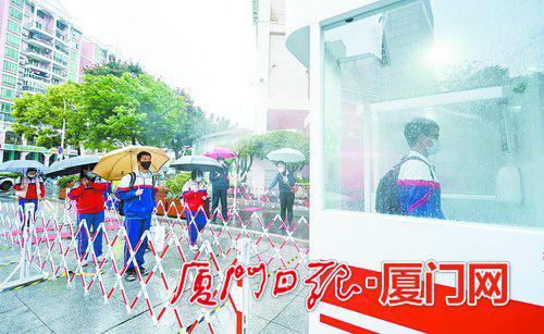 ▲厦门一中的学生排队通过测温机器后进入校园。