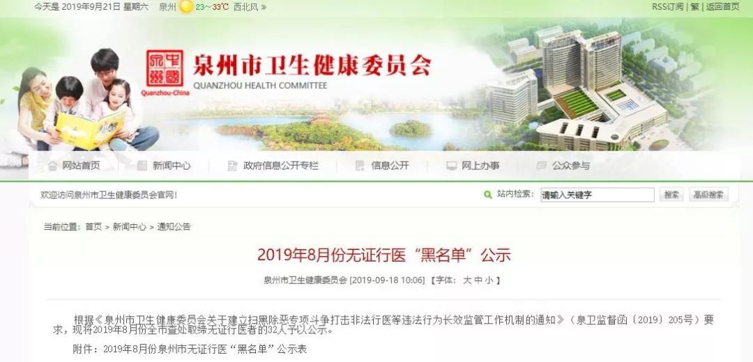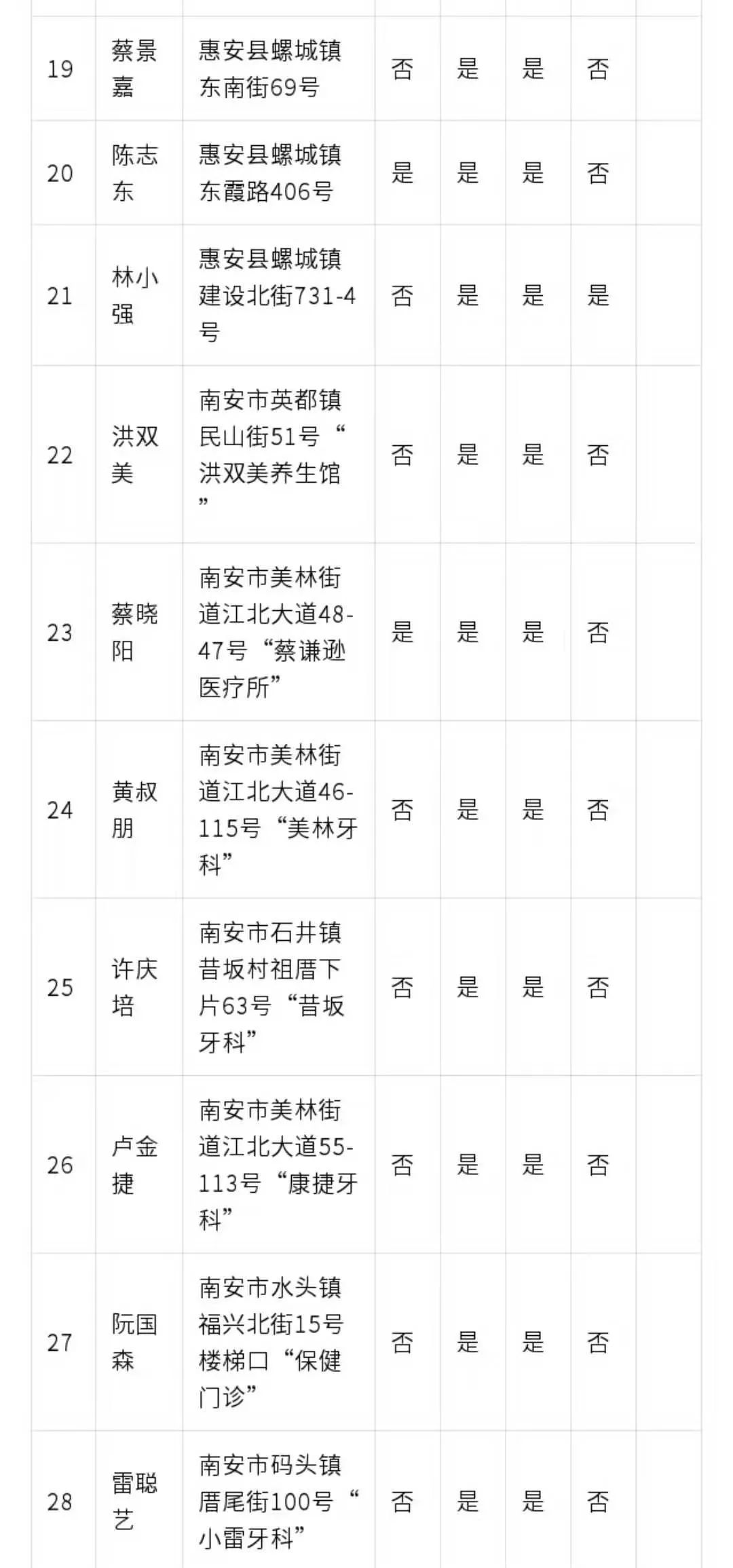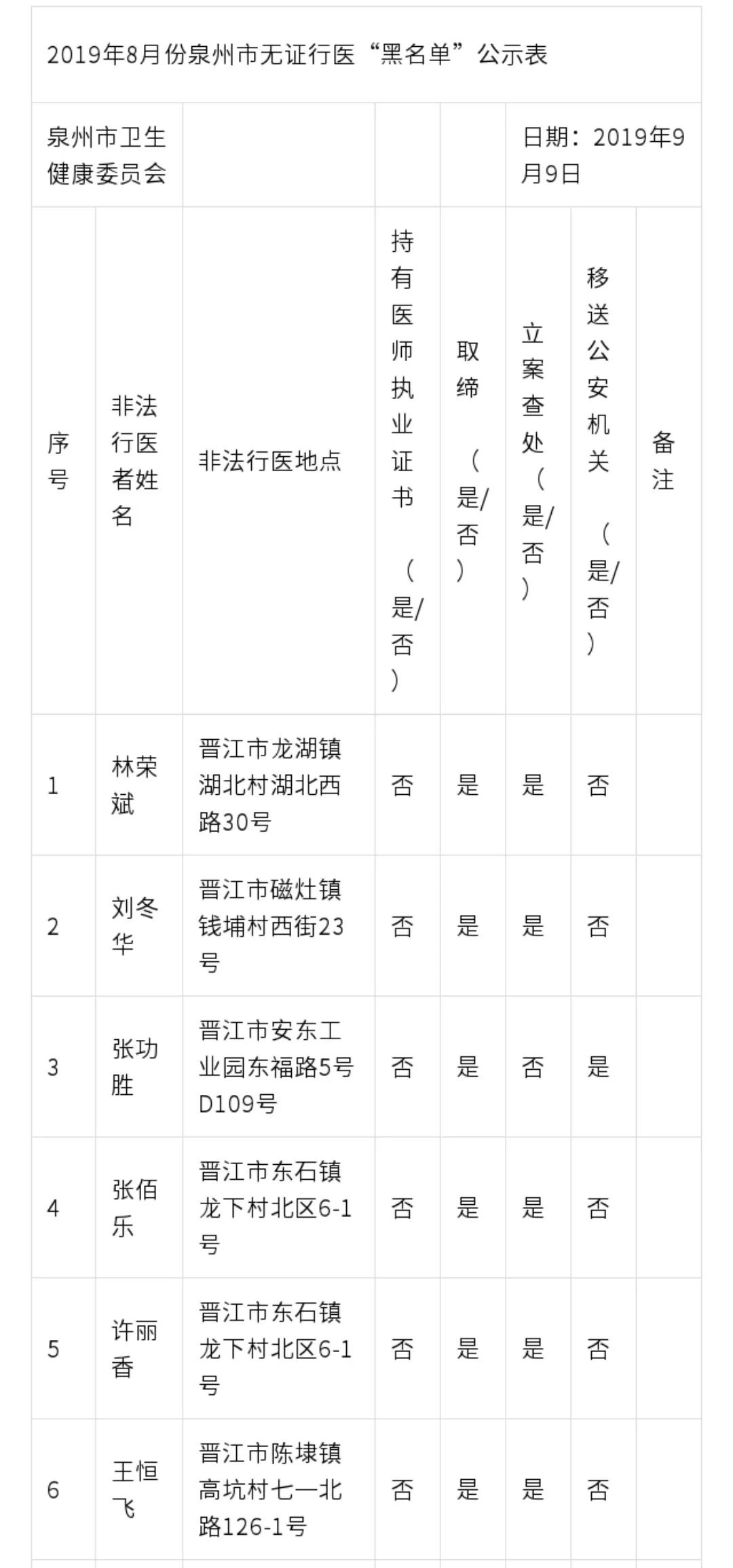 2019年8月份泉州市无证行医“黑名单”公示表大家一定要擦亮眼睛