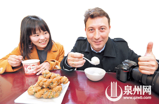 元宵即将到来,意大利摄影师艾罗斯和妻子林园园在市区金鱼巷吃上元丸,共度中国传统佳节。 (陈英杰 摄)这不,就在前天,听闻泉州市区花灯已经高挂,艾罗斯和他的中国妻子林园园,从石狮家里来到泉州市区,看花灯、听南音、吃上元丸……走街串巷,拍照赏灯,提前体验了一把老泉州的元宵节。