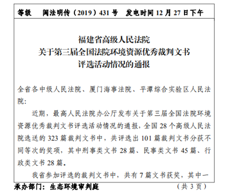 2020年4月,龙岩中院生态庭庭长丁斌制作的“龙岩罗佛金与吴木材等7人、营斗村委会水污染纠纷案”裁判文书及生态庭副庭长许虹菁制作的“龙岩长汀县中华村委会与长汀县中华村第五、第八村民小组、丘思林等林权合同纠纷案”裁判文书一并入选“福建生态司法十份优秀文书”。