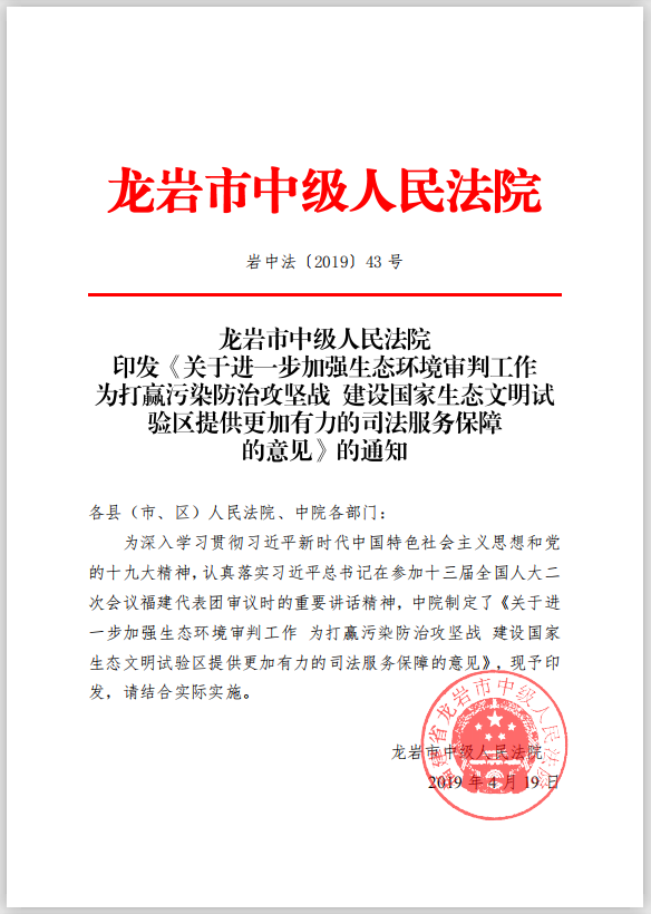 2019年以来,龙岩中院认真学习贯彻习近平总书记参加十三届全国人大二次会议福建代表团审议时的重要讲话精神,坚持绿水青山就是金山银山,多做经济发展和生态保护相协调相促进的文章,强化政治担当,勇于先行先试,创新生态司法保护机制,为国家生态文明试验区建设和打好污染防治攻坚战提供有力司法服务保障。