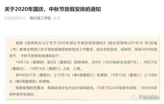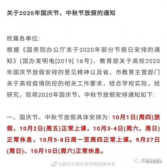 近日,福建农林大学学生会发布了2020年国庆节、中秋节放假的通知,国庆只放假4天,国庆、中秋部分节假日调整至寒假。