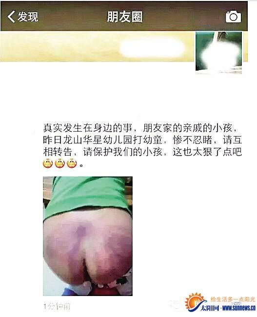 晨报讯(特派漳州记者 黄小英)昨日,一个名为“微米南靖微生活”的微信公共号发布信息称,南靖龙山华星幼儿园发生一起虐童事件,一个五六岁的儿童被幼儿园老师打得到处淤青,微信还配发了一段小视频,视频内一个小孩的屁股被打得发紫。