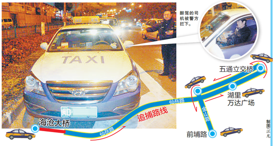 “快到海沧大桥设卡盘查。”接到报警电话,市公安局指挥中心立即发出指令。7点多,这一辆摇摇晃晃的出租车进入民警视野,民警急忙上前,示意其靠边停车。哪知出租车司机伸出手挥了挥,同时猛地踩了脚油门,“我赶时间……”后面的话还没听清,就冲过关卡,绝尘而去。
