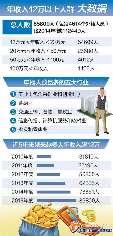 又到了年收入PK的季节,2015年你的收入超过12万元了没?昨日,记者从厦门市地税局获悉,2015年,年所得12万元以上纳税人自行纳税 申报的有85800人(包括4614名外籍人员)。这意味着,随着社会大众收入的普遍增长,过去的一年,又有12449人加入了12万收入的大军。