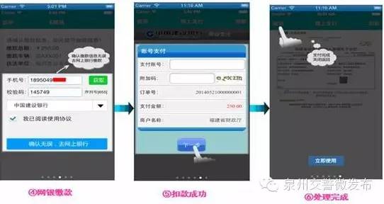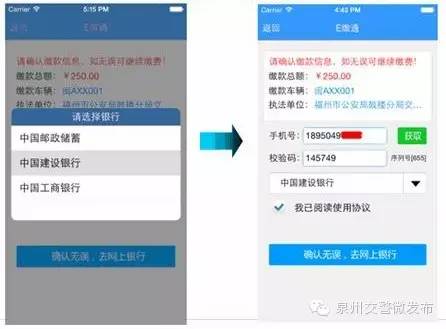2.平台暂不能够处理2010年之前发生的,及外省籍车辆在福建省的技术监控违法行为。目前,平台仅支持工商银行、建设银行、中国银行、兴业银行,网上缴费业务有电子票据,如需纸质票据,可凭电子票信息到指定代理银行打印。