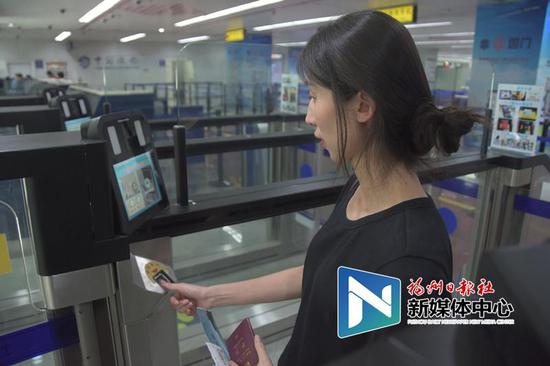 当日,在长乐国际机场出境边防检查大厅,出境旅客在边检民警的引导下,按照“扫描登机牌、刷护照读取信息、按指纹拍照片”的顺序,只需3个步骤即完成出境边检查验手续,最快10秒即能通关,相对人工查验用时缩短了三分之二。