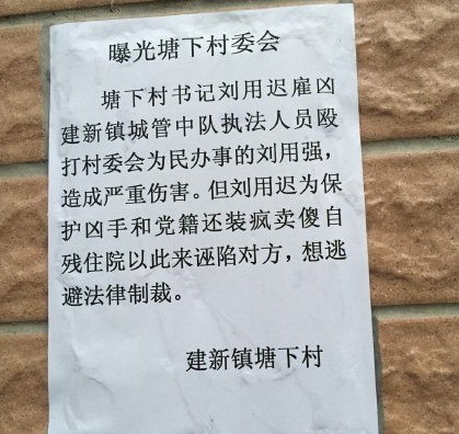 昨日,记者在微博网友“我就是我愿我是我”发布的图片上看到,一张“公告”贴在墙上,文中称建新镇塘下村党支部书记刘某雇建新镇城管中队执法人员殴打该村村委会干部刘某某,造成严重的伤害。但刘某为保护凶手,以自残的方式住院来诬陷对方。记者注意到,该“公告”落款为“建新镇塘下村”,但并没有该村委会的任何盖章。