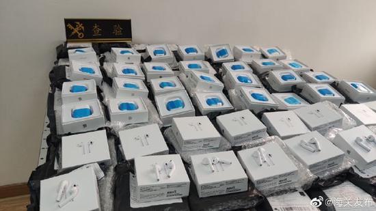 台海网10月30日讯 据@海关发布 微博消息,福州海关所属榕城海关查获一批侵权无线耳机。