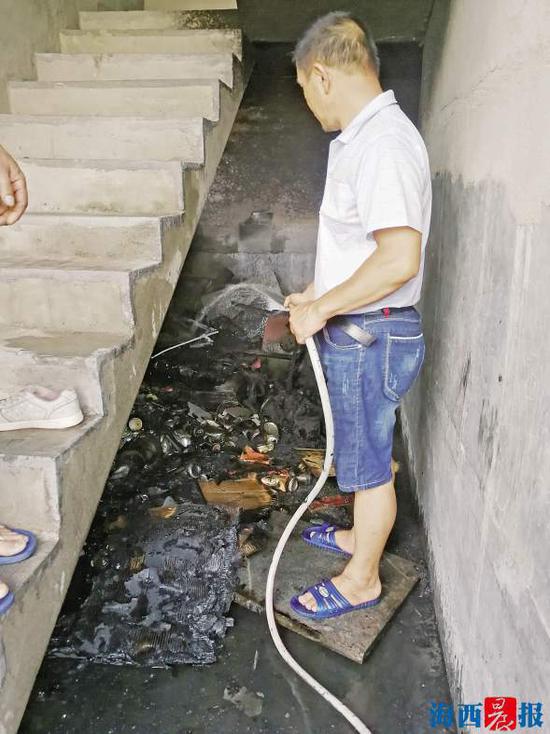 距离发现火灾十多分钟后,火势被完全扑灭。连思斌满头大汗,脸上、身上沾了不少灰。临回家前,连思斌还不忘提醒邻居不要堆放那么多杂物,要注意防火。