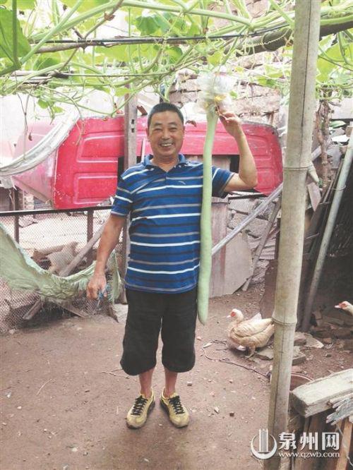 并没有精心地浇水施肥,泉州市民曾先生种的葫芦瓜居然“奇迹般”地长成了1.07米的“高个子”,亲朋好友慕名前来“赏瓜”,啧啧称奇。