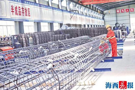 钢筋笼在施工中主要用于打桩施工。在3号标准化钢筋加工场内,一段段已加工成型的钢筋笼有序摆放。而这些钢筋笼,仅需两名工人协作,操作机器即可完成加工。