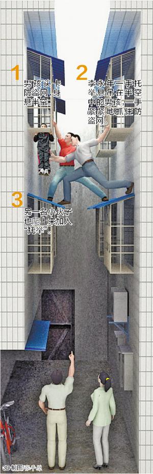 厦门幼童头卡防盗网悬空6米 两市民跨楼托举20分钟